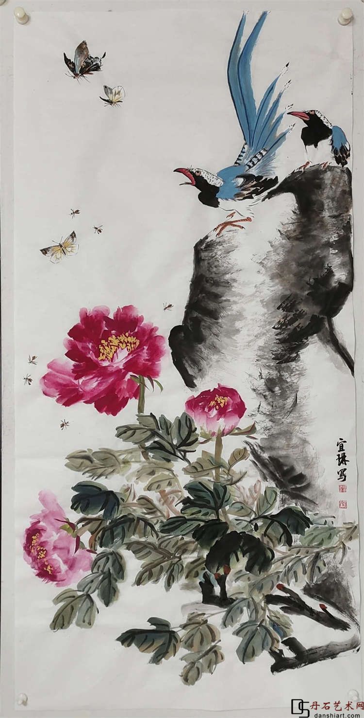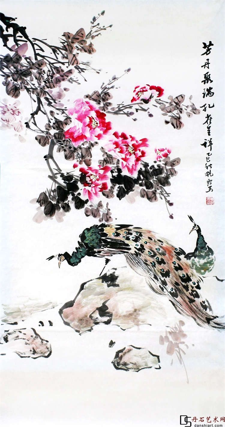 韩艳霞《芳丹聚瑞孔雀呈祥》国画69cmx138cm
